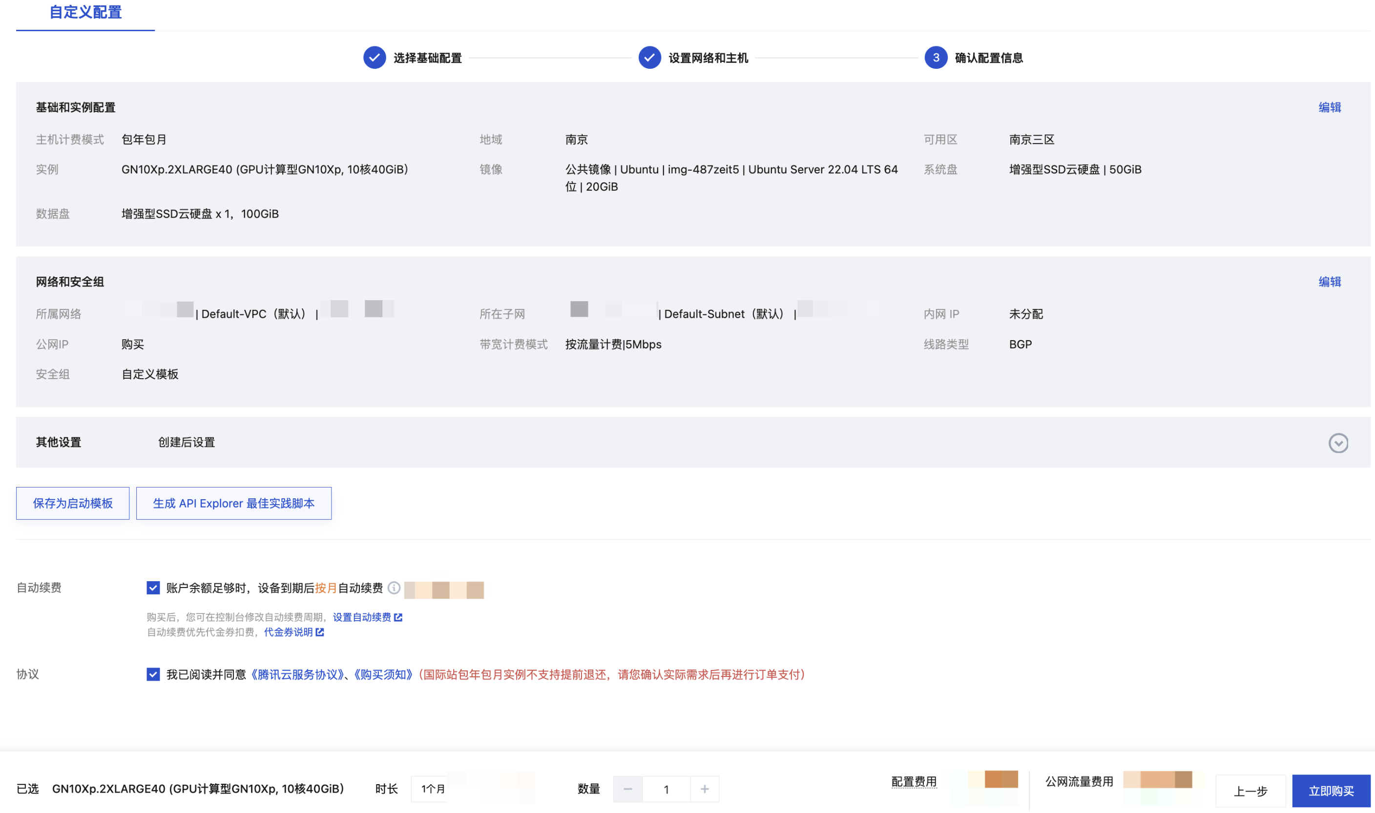 确认实例规格、镜像选择、存储和带宽选择以及安全组等配置项是否符合预期。