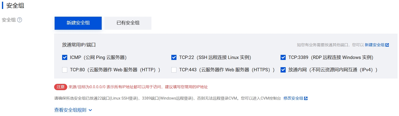 2. 新建或选择已有安全组,控制端口的开放范围。如下图所示: