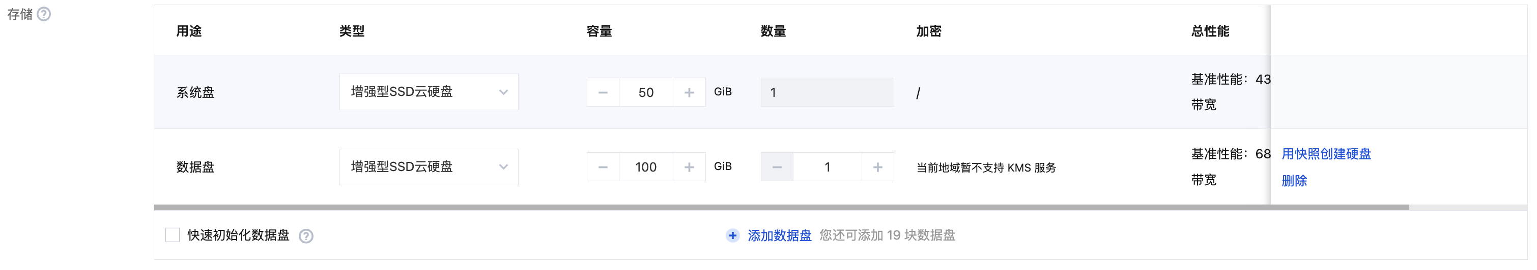 2. 选择 GPU 云服务器的存储,系统盘和数据盘类型和大小均可灵活选择。如下图所示: