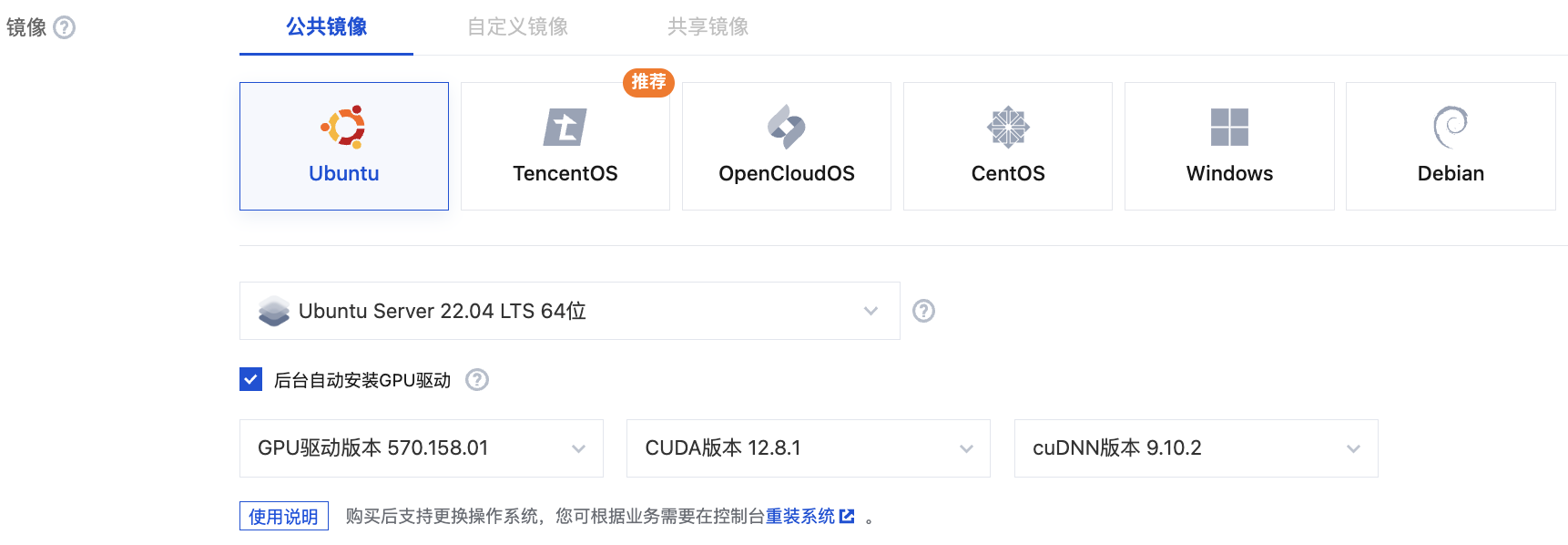 GPU 云服务器目前支持三种镜像类型:公共镜像、自定义镜像、共享镜像。详情请参见 镜像概述。 刚开始使用腾讯云的用户,可选择公共镜像,并根据需要挑选版本。如下图所示: