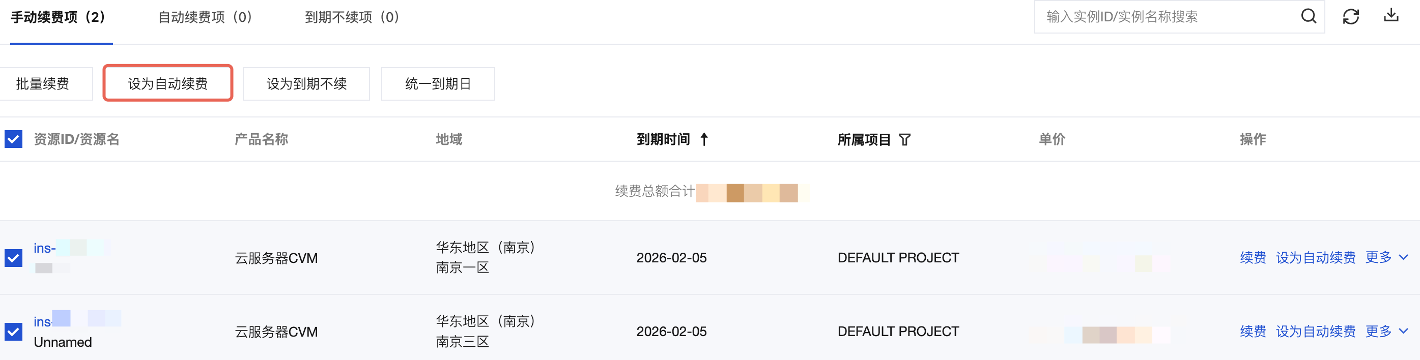 1. 勾选所有需要设置自动续费的包年包月类型实例,单击顶部的设为自动续费。如下图所示: