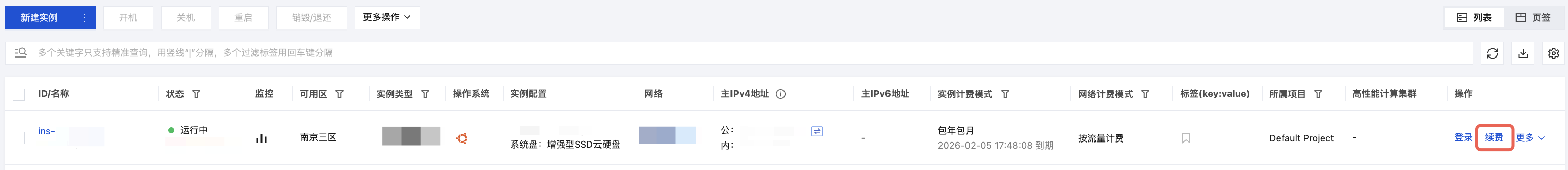 2. 选择需要续费的实例行,并在该实例行中单击续费。如下图所示: