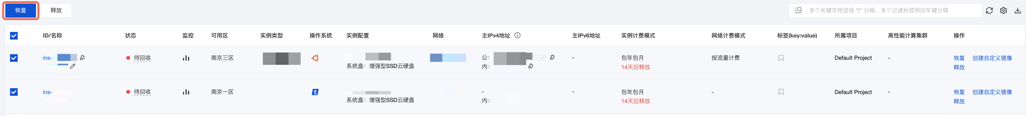 a. 勾选所有需要续费的实例,单击顶部的恢复。如下图所示: