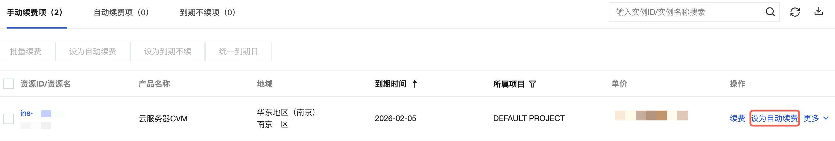 1. 选择需要设置自动续费的包年包月类型实例行,并在该实例行中单击设为自动续费。如下图所示: