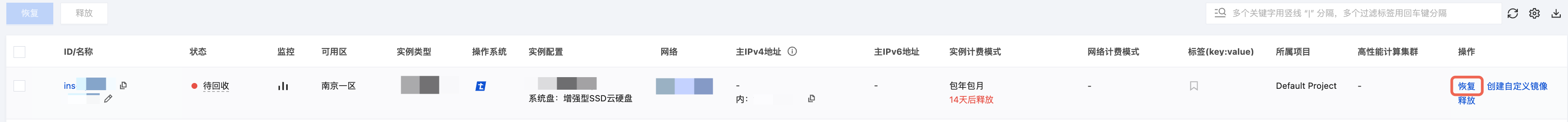 a. 选择需要续费的实例行,并在该实例行中单击恢复。如下图所示: