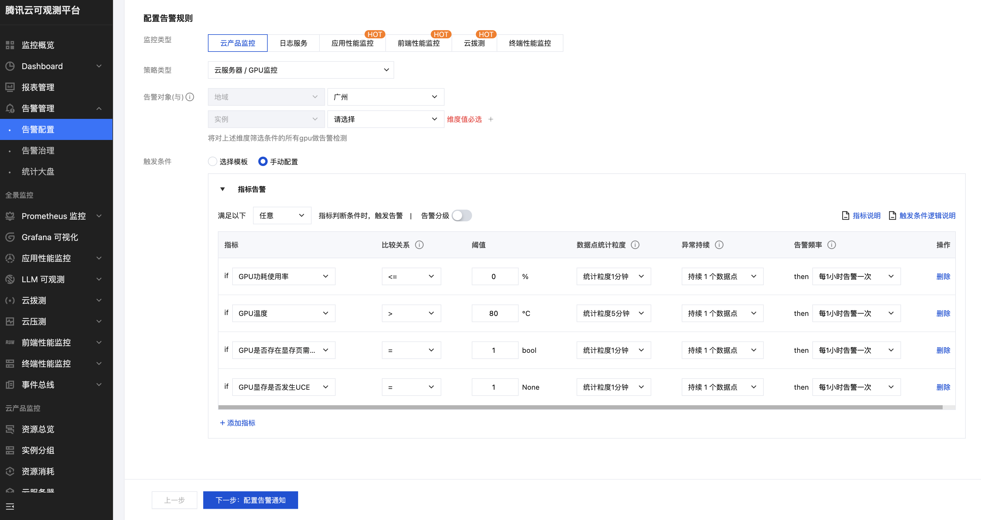 GPU 温度 | 持续5分钟>80 | 当 GPU 温度过高时可能会导致 GPU SlowDown,影响业务性能。 | |