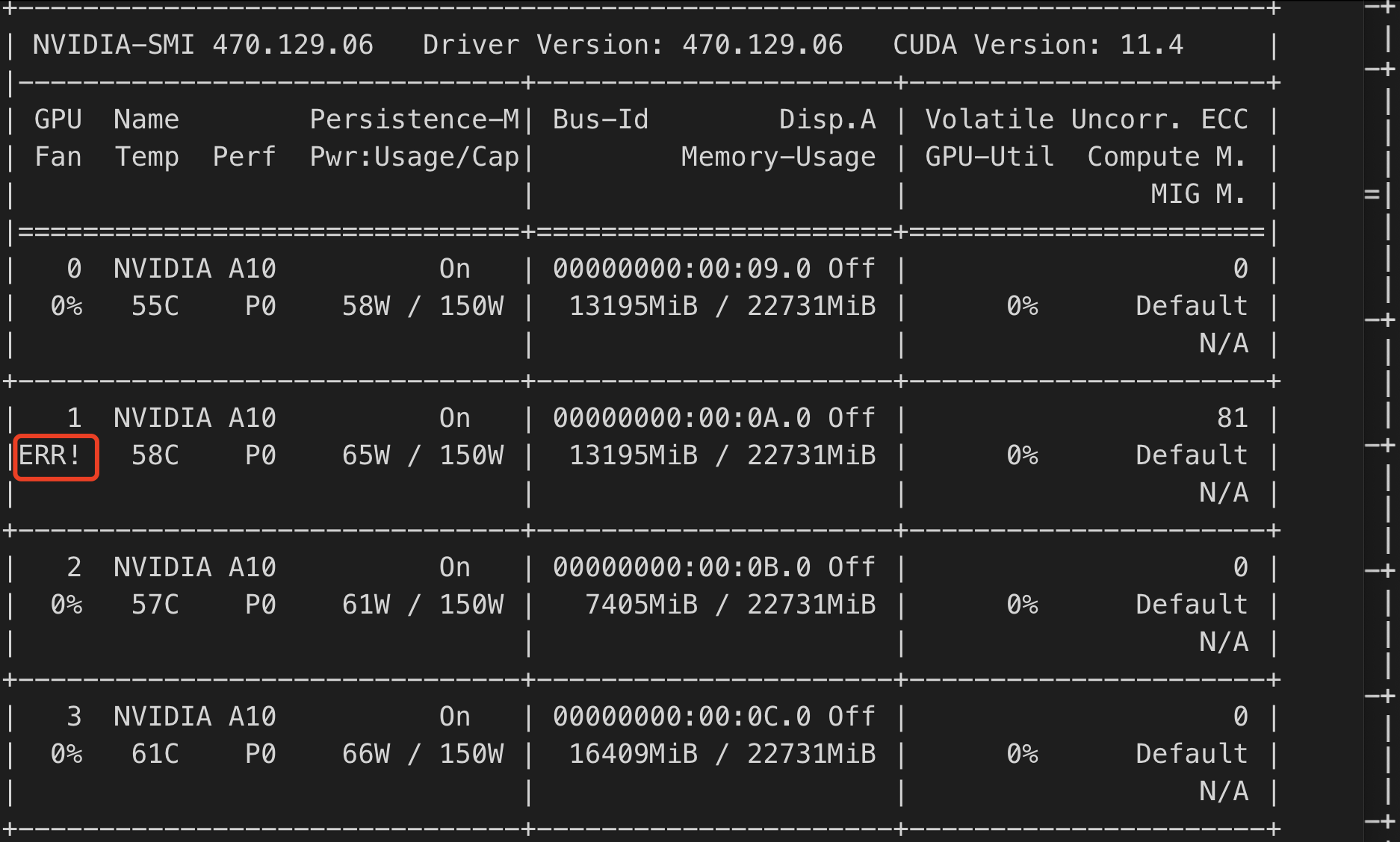 #如下命令表示识别到4个GPU,且末尾标识为(rev a1)的GPU状态正常;41:00.0 GPU末尾标识为(rev ff),表示该GPU状态异常。~]# lspci | grep -i nvidia3e:00.0 3D controller: NVIDIA Corporation Device 1db8 (rev a1)3f:00.0 3D controller: NVIDIA Corporation Device 1db8 (rev a1)40:00.0 3D controller: NVIDIA Corporation Device 1db8 (rev a1)41:00.0 3D controller: NVIDIA Corporation Device 1db8 (rev ff)