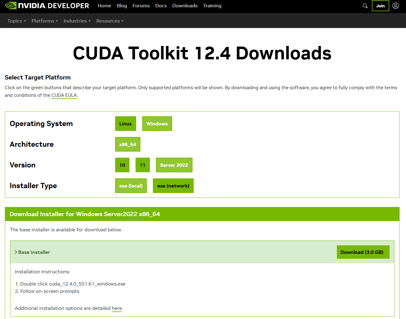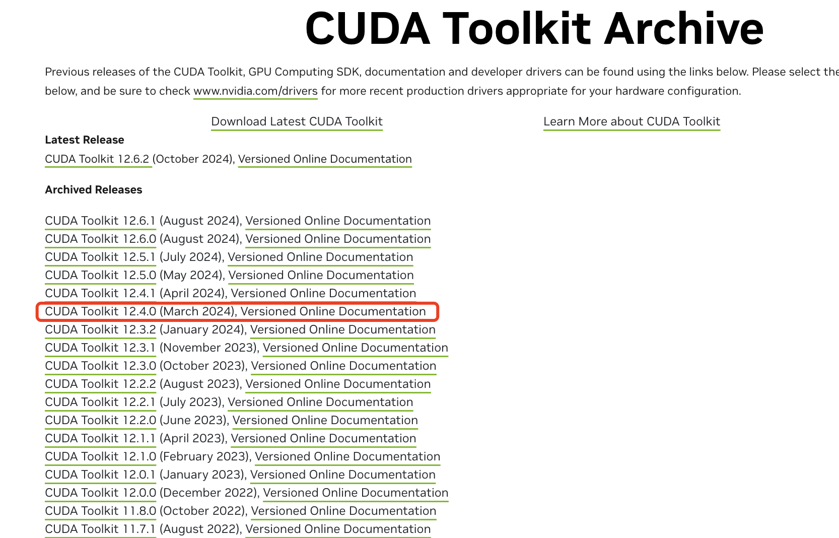 3. 选择对应的 CUDA 版本,本文以 CUDA Toolkit 12.4.0 为例。如下图所示: