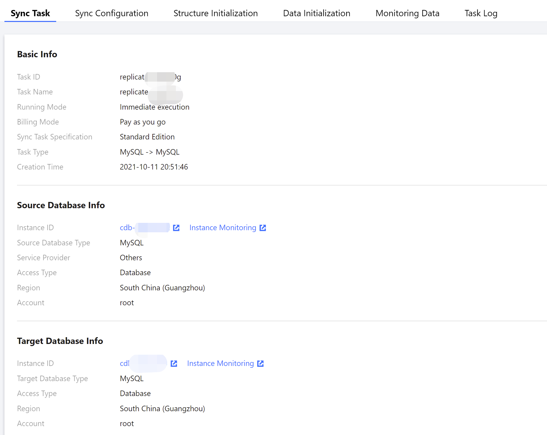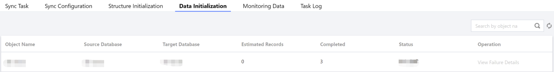 通过任务详情信息,用户可查看同步任务、同步配置、结构初始化、数据初始化、监控数据等信息。