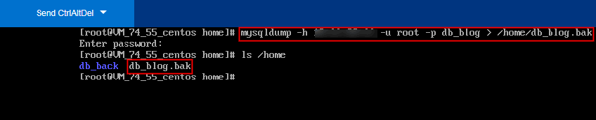 1. 登录 CVM,使用 MySQL 命令行工具 mysqldump 生成待导入的 SQL 文件。以云数据库上的 db_blog 数据库为例。