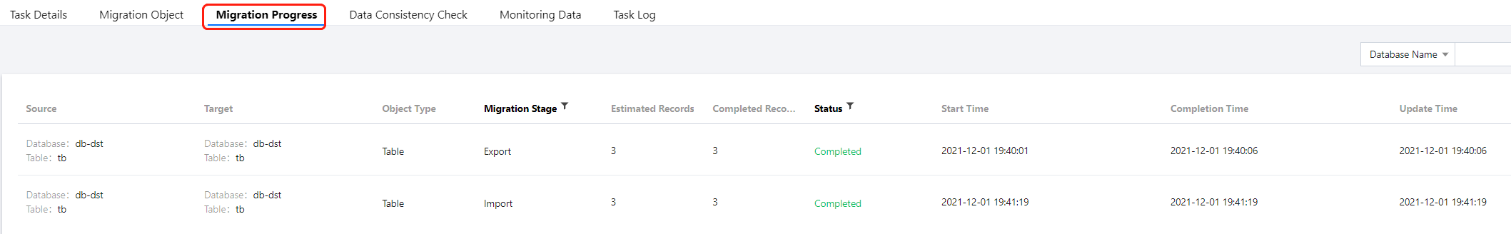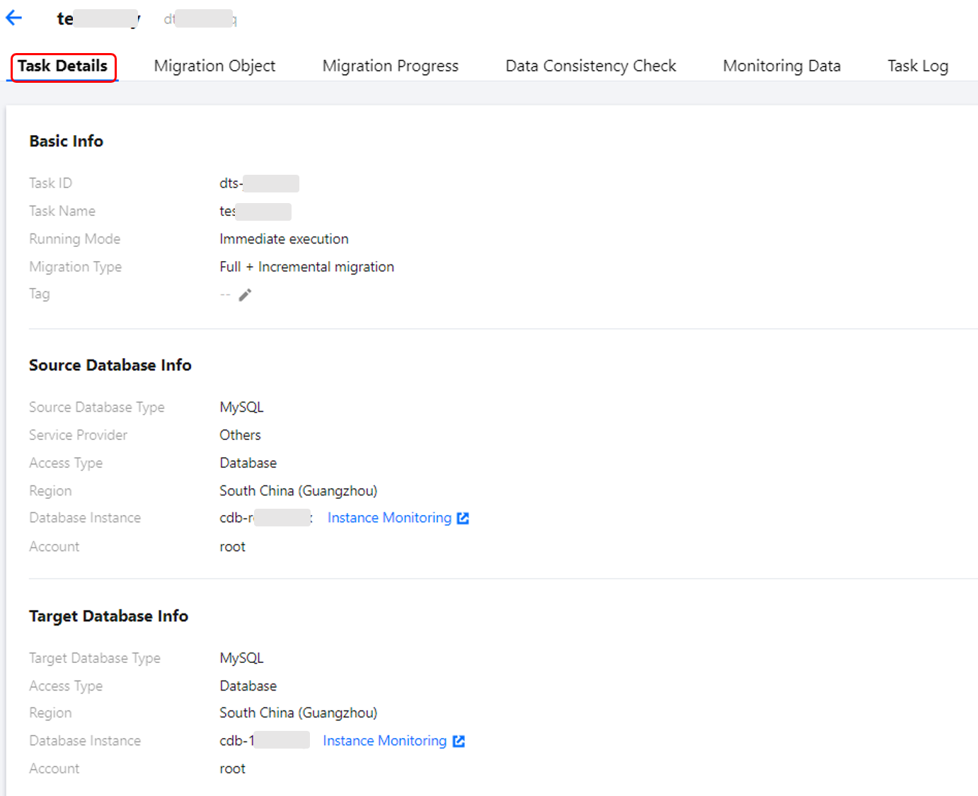 数据迁移任务创建成功后,可查看迁移任务详情(包括源数据库信息、目标数据库信息、迁移类型)、迁移对象、迁移进度详情等。