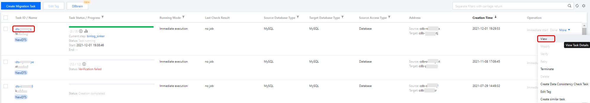 方式二:在数据迁移页面,选择指定的迁移任务,在操作列选择更多 > 查看。