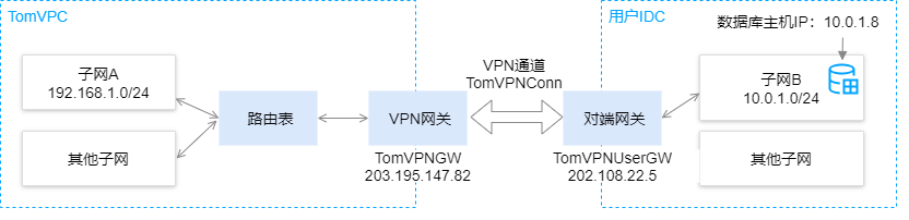 192.168.1.0/24。新建 VPN 网关为“TomVPNGW”,VPN 网关的公网 IP 为203.195.147.82。用户 IDC 数据库的主机IP地址为10.0.1.8。