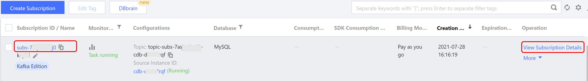 数据订阅任务创建成功后,用户可查看订阅任务详情。