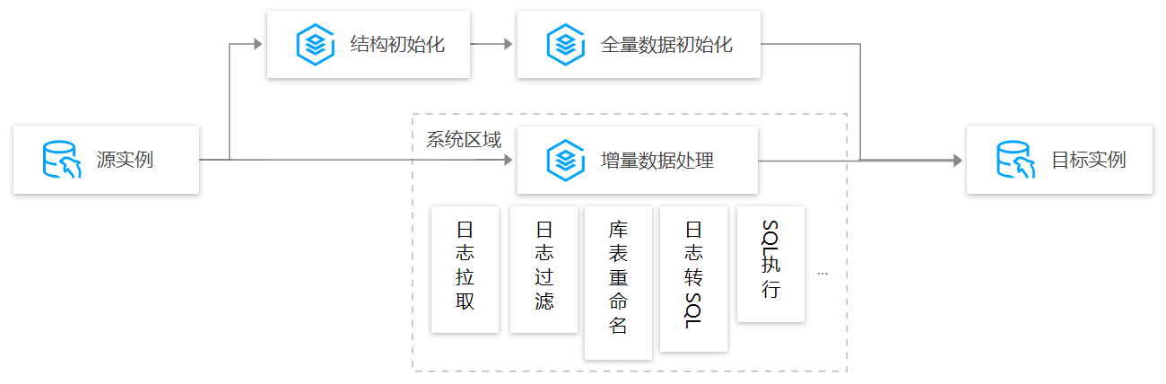 如下以 MySQL 同步为例进行介绍。整体流程为,数据从源实例中导出并导入到目标实例中,关键步骤包括结构初始化、全量数据初始化及增量数据处理。