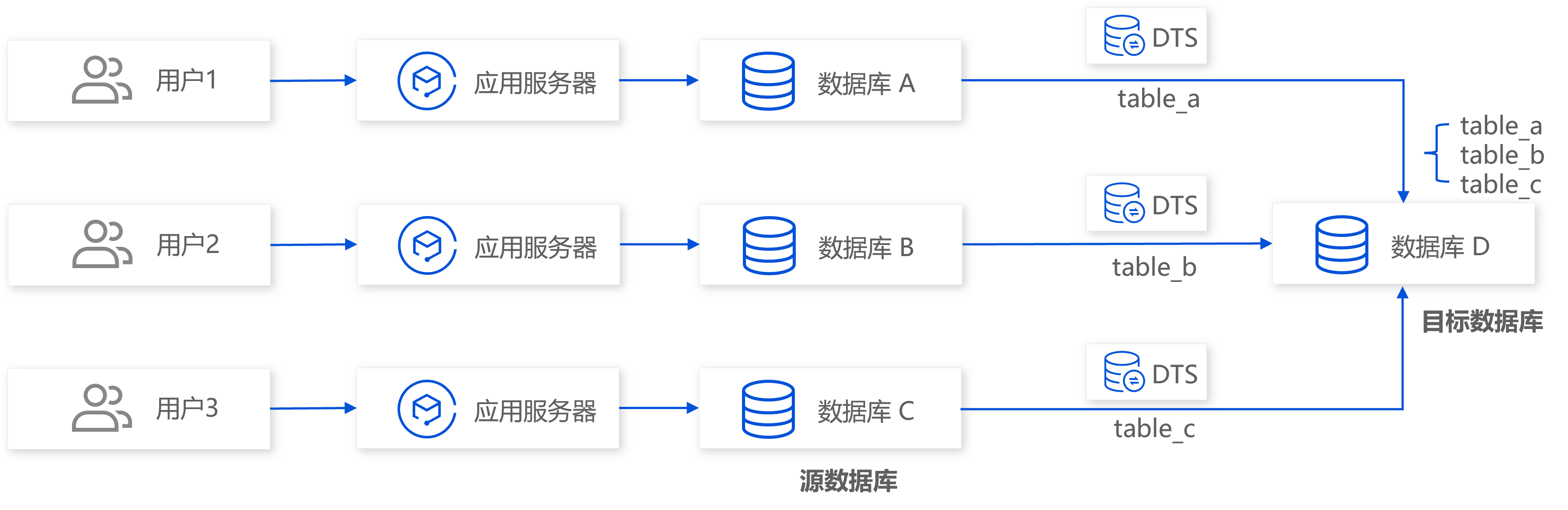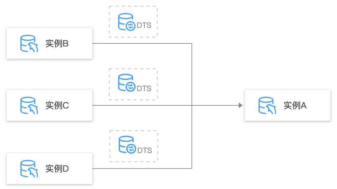 通过 DTS 多对一同步将不同数据库上的数据汇聚到同一个目标库上,方便业务数据整合和聚合分析。