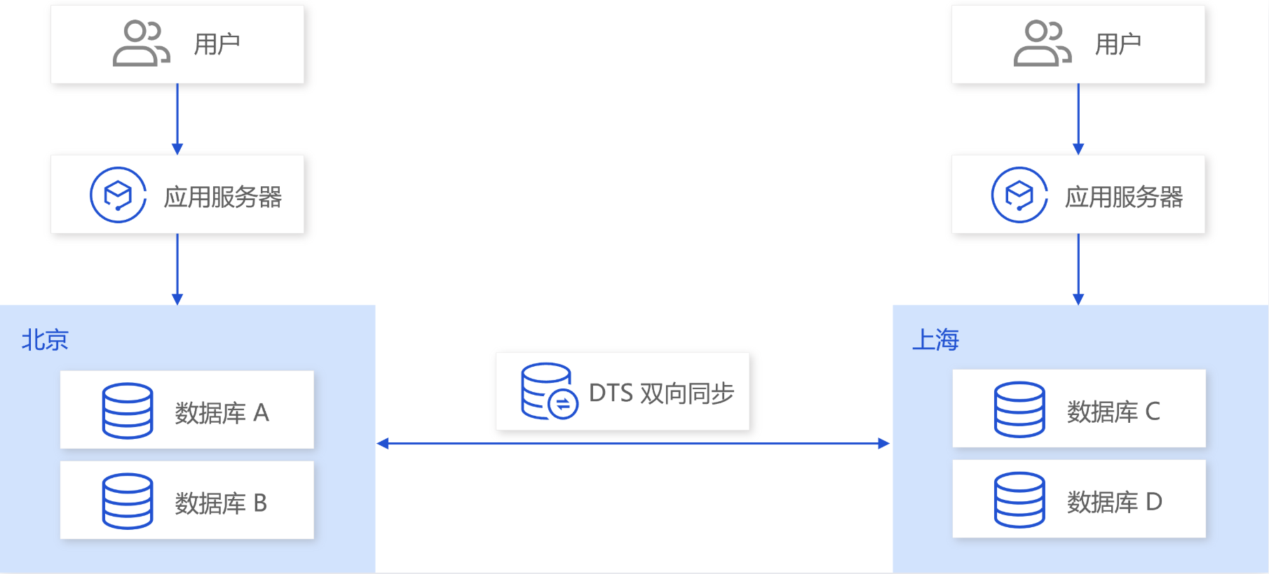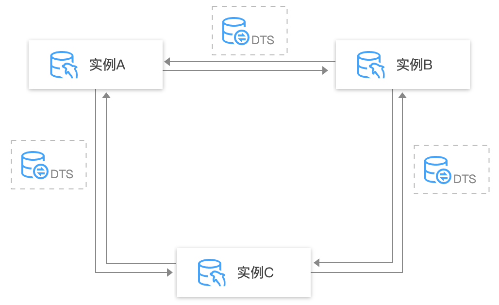 通过 DTS 数据同步服务在多地域的数据库间建立数据实时同步,可实现异地双活。其中各地域的数据库实例可以运行在云上,也可以运行在企业自建数据中心。