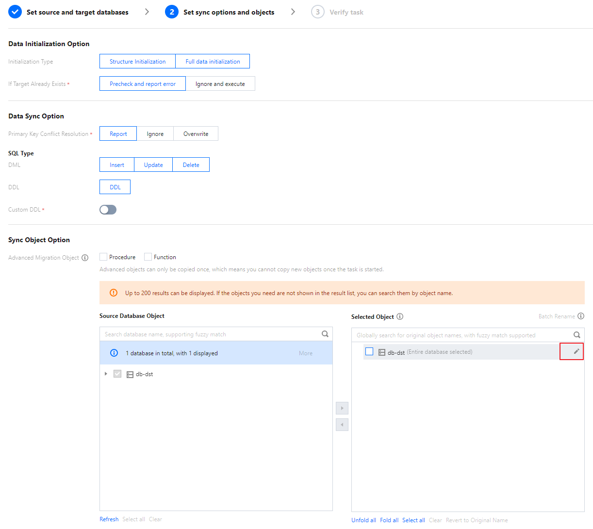 在“设置同步源和目标数据库”步骤中,在选择同步对象右侧“已选对象”中,将鼠标悬浮在需要修改的对象上,即可显示编辑按钮。