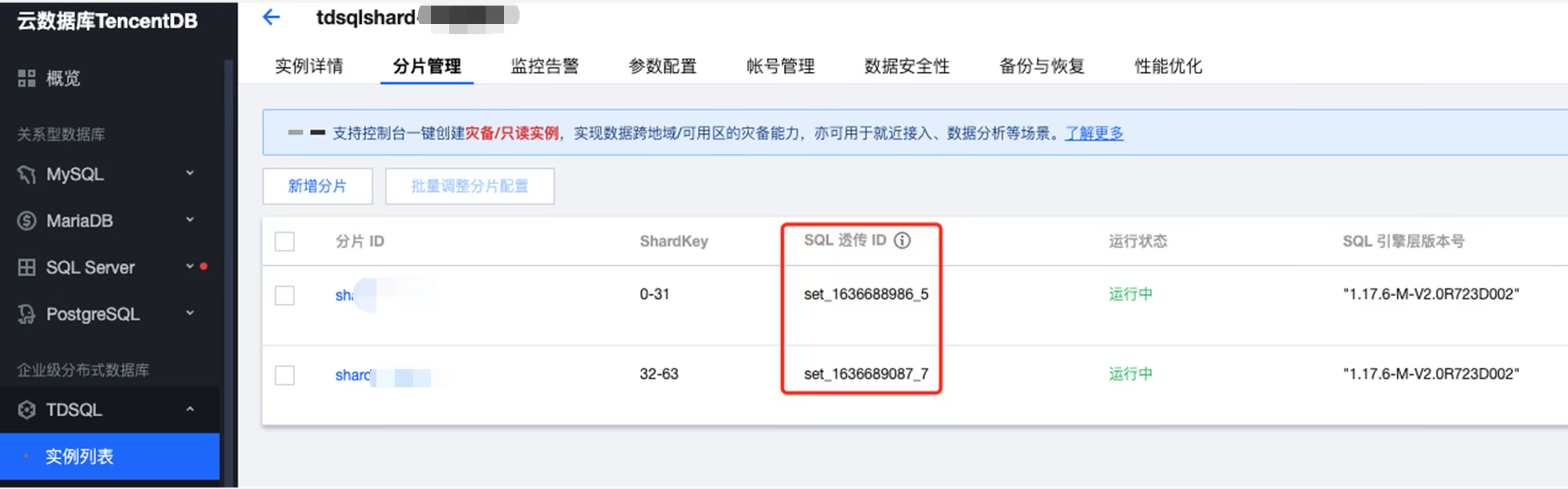 Kafka 中的每条消息的消息头中都带有分片信息,以 key/value 的形式存在消息头中,key 是 ShardId,value 是 SQL 透传 ID,可根据 SQL 透传 ID 区分该消息来自哪个分片。用户可以在 TDSQL 控制台 > 实例列表 > 分片管理中查看 SQL 透传 ID。 支持订阅的 SQL 操作