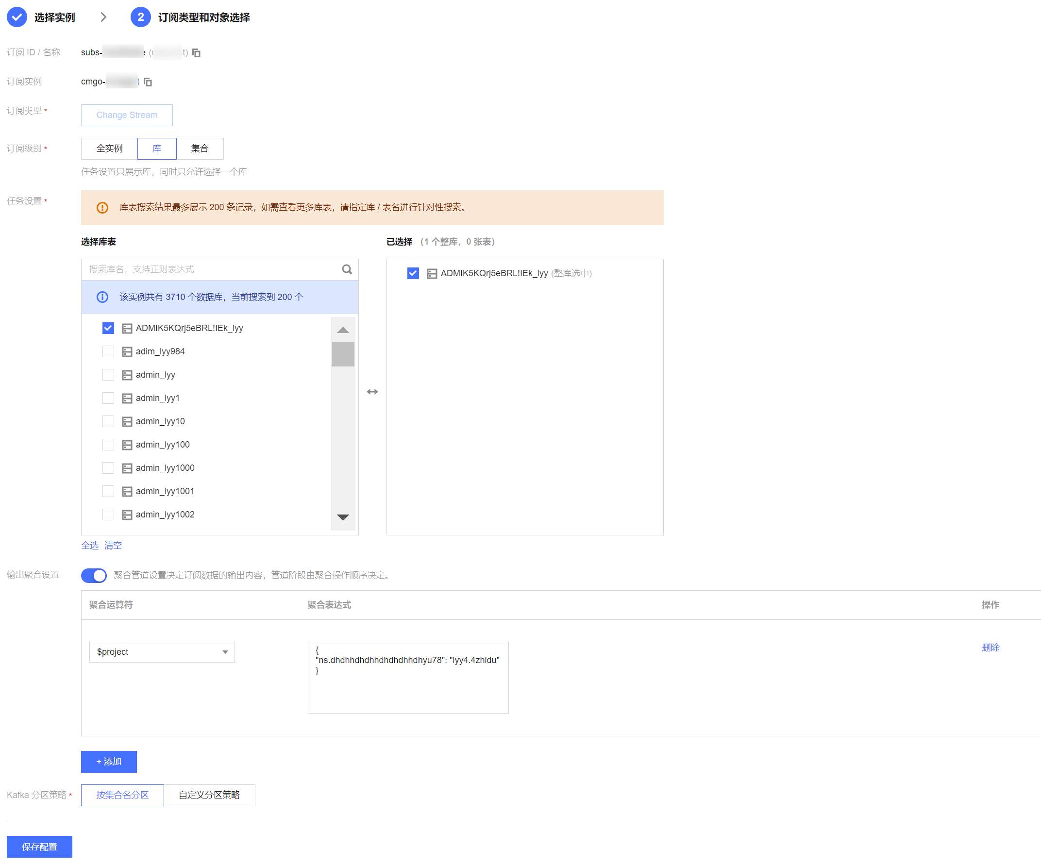 Kafka 分区策略 | 按集合名分区:将源库的订阅数据按照集合名进行分区,设置后相同集合名的数据会写入同一个 Kafka 分区中。 自定义分区策略:先通过正则表达式对订阅数据中的库名和集合名进行匹配,匹配到的数据再按照集合名分区、集合名 + objectid 分区。 |