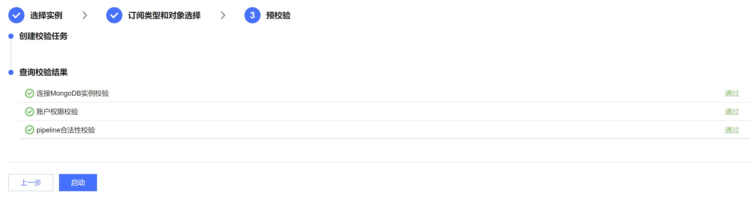 6. 在预校验页面,预校验任务预计会运行2分钟 - 3分钟,预校验通过后,单击启动完成数据订阅任务配置。