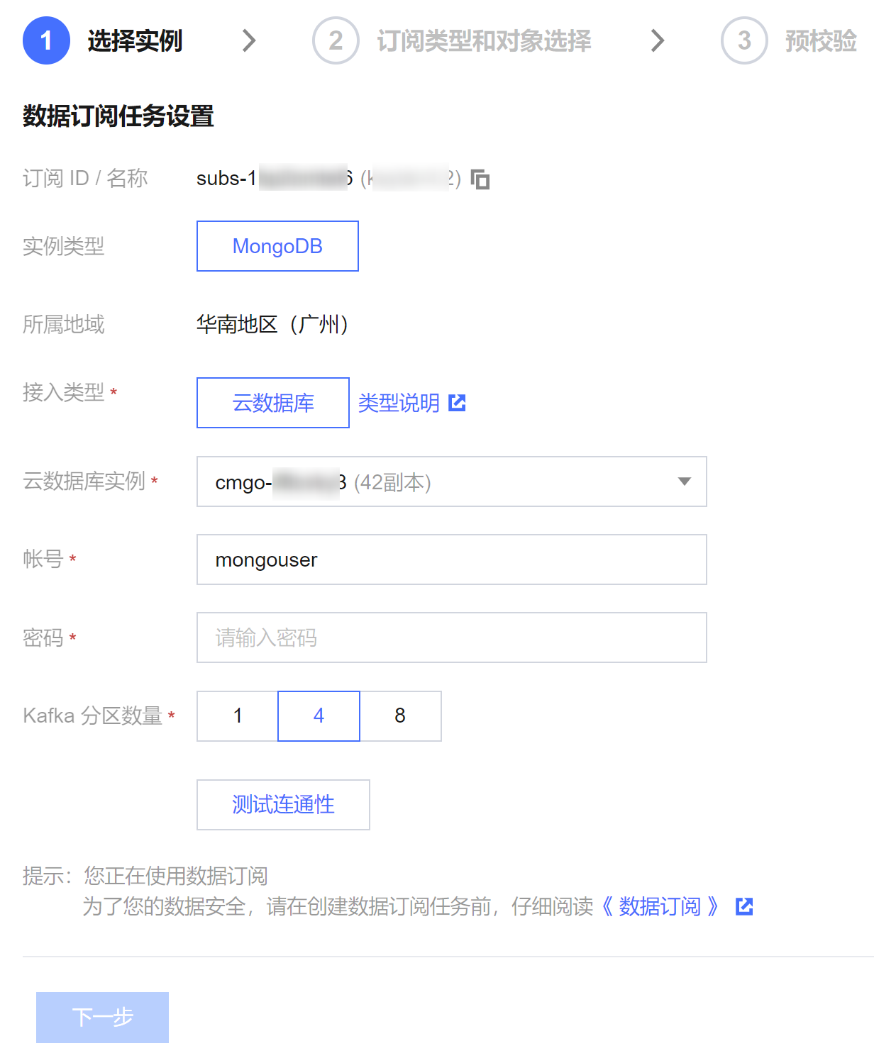 3. 购买成功后,返回数据订阅列表,选择刚才购买的任务,在操作列单击配置订阅。 4. 在配置数据库订阅页面,配置源库信息后,单击测试连通性,通过后单击下一步。