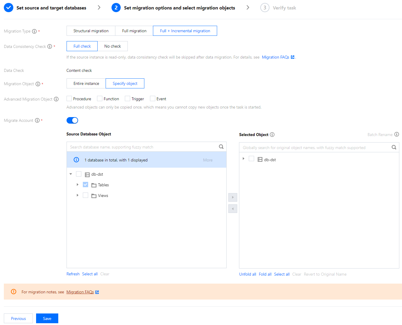 1. 在 数据迁移任务 的设置迁移选项及选择迁移对象页面,勾选是否迁移账号。 2. 校验任务中会检查源库的账号信息,并对符合要求的账号进行迁移。