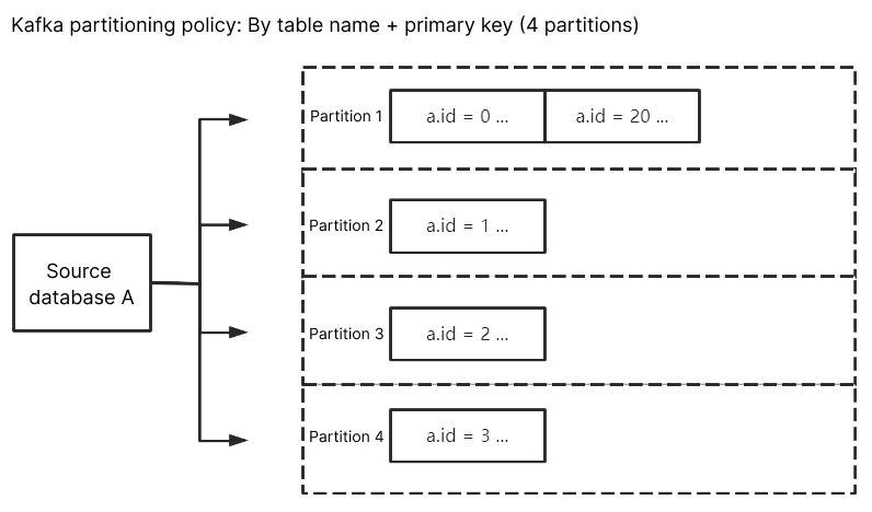 当仅指定按照表名分区时,如果一张表为热点数据,则按照表名分区,该 Kafka 分区的压力会非常大。通过表名+主键分区将数据分散到不同分区中,提升并发消费效率。