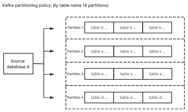 Kafka 分区策略 - 按表名分区:将源库的订阅数据按照表名进行分区,设置后相同表名的数据会写入同一个 Kafka 分区中。在数据消费时,同一个表内的数据变更总是顺序获得。