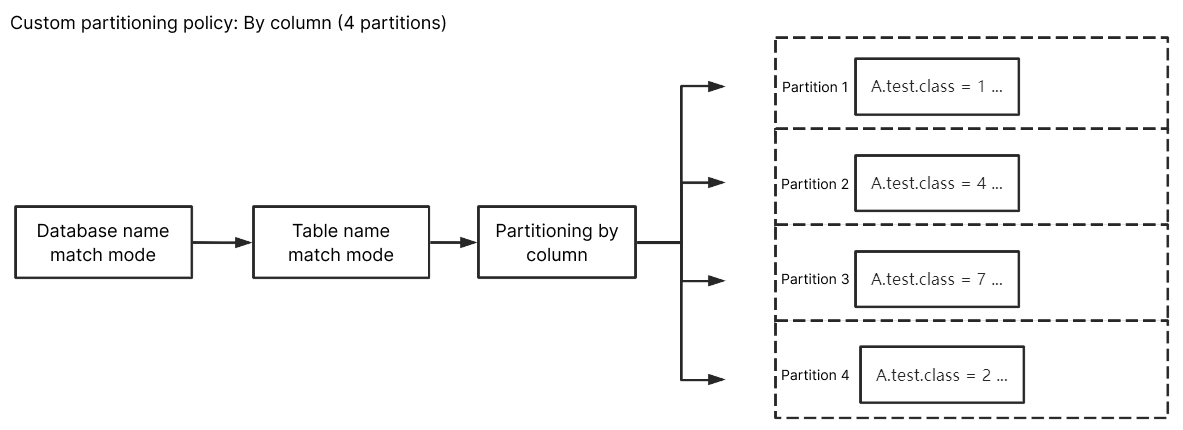 自定义分区策略,是通过正则表达式对库名和表名进行匹配,匹配后的数据再按照表名、表名+主键、列进行分区。