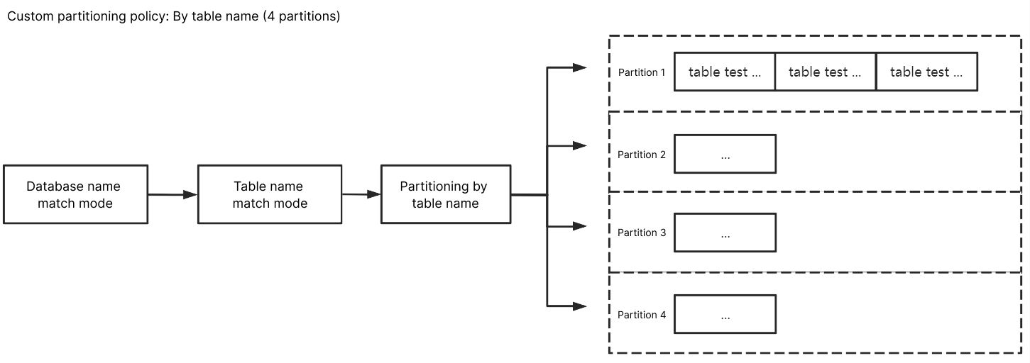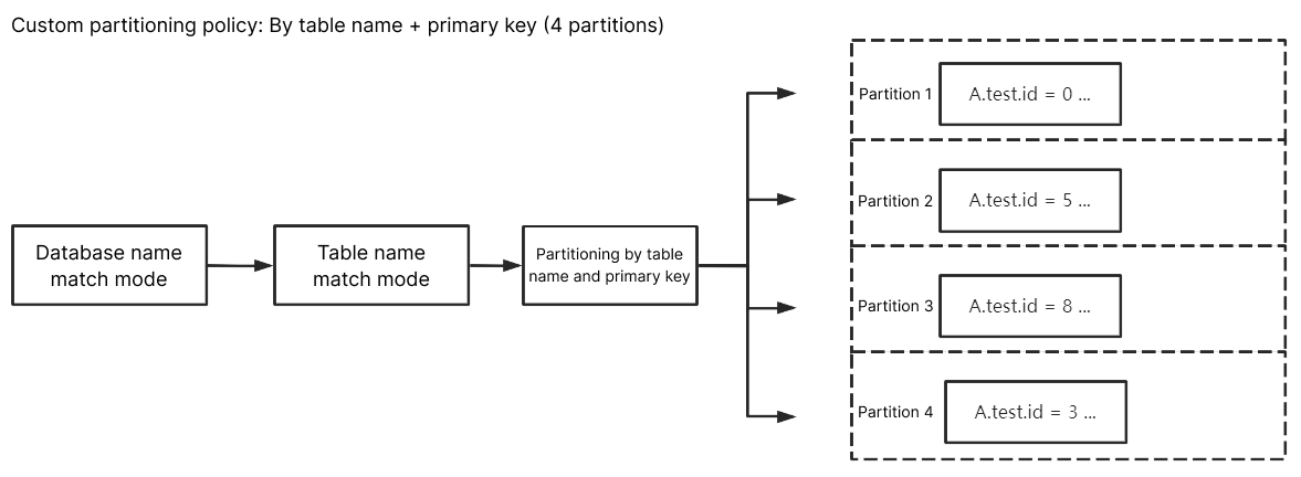自定义分区策略:先通过正则表达式对订阅数据中的库名和表名进行匹配,匹配后的数据再按照表名、表名+主键、列进行分区。
