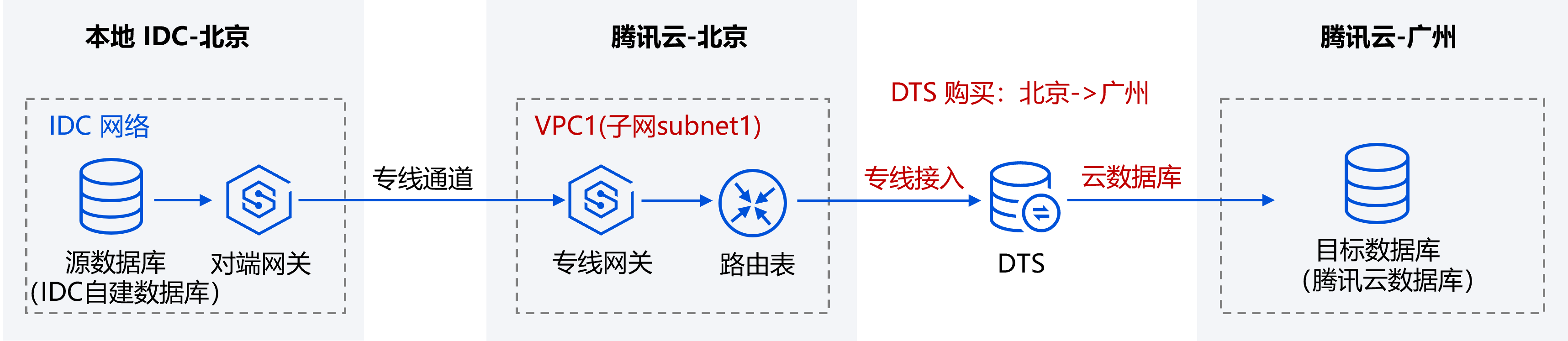 DTS 支持将本地 IDC 数据库作为源/目标进行数据传输,如下示例场景为:本地 IDC 数据库(专线接入) -> 腾讯云数据库(云数据库)。