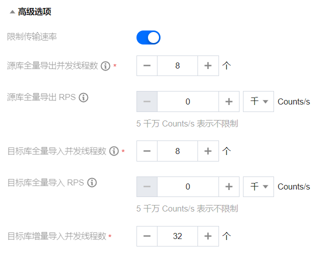 DTS 任务全量导出并发线程数默认为8,一般情况下不需要修改。如遇需要调整,请结合监控指标,源库/目标库配置,在不影响源库/目标库性能的前提下,最大程度提升 DTS 传输速率。