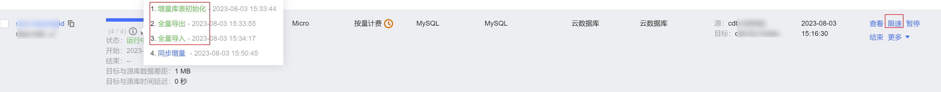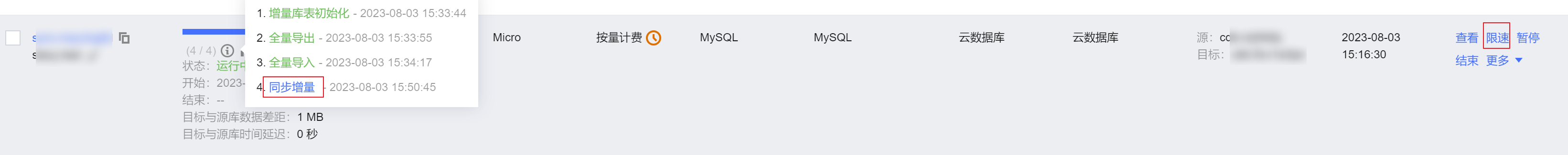 1. 登录 DTS 控制台,在左侧导航选择数据同步页,选择指定的同步任务。 2. 在全量数据同步阶段进行限速操作。