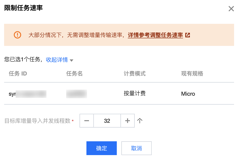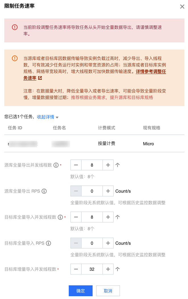 任务在全量数据同步阶段进行限速操作,可以修改全量 + 增量的速率参数(全量导出线程数和 RPS,全量导入线程数和 RPS,增量导入线程数);任务在增量数据同步阶段进行限速操作,仅可修改增量的速率参数(增量导入线程数),具体操作参考如下。
