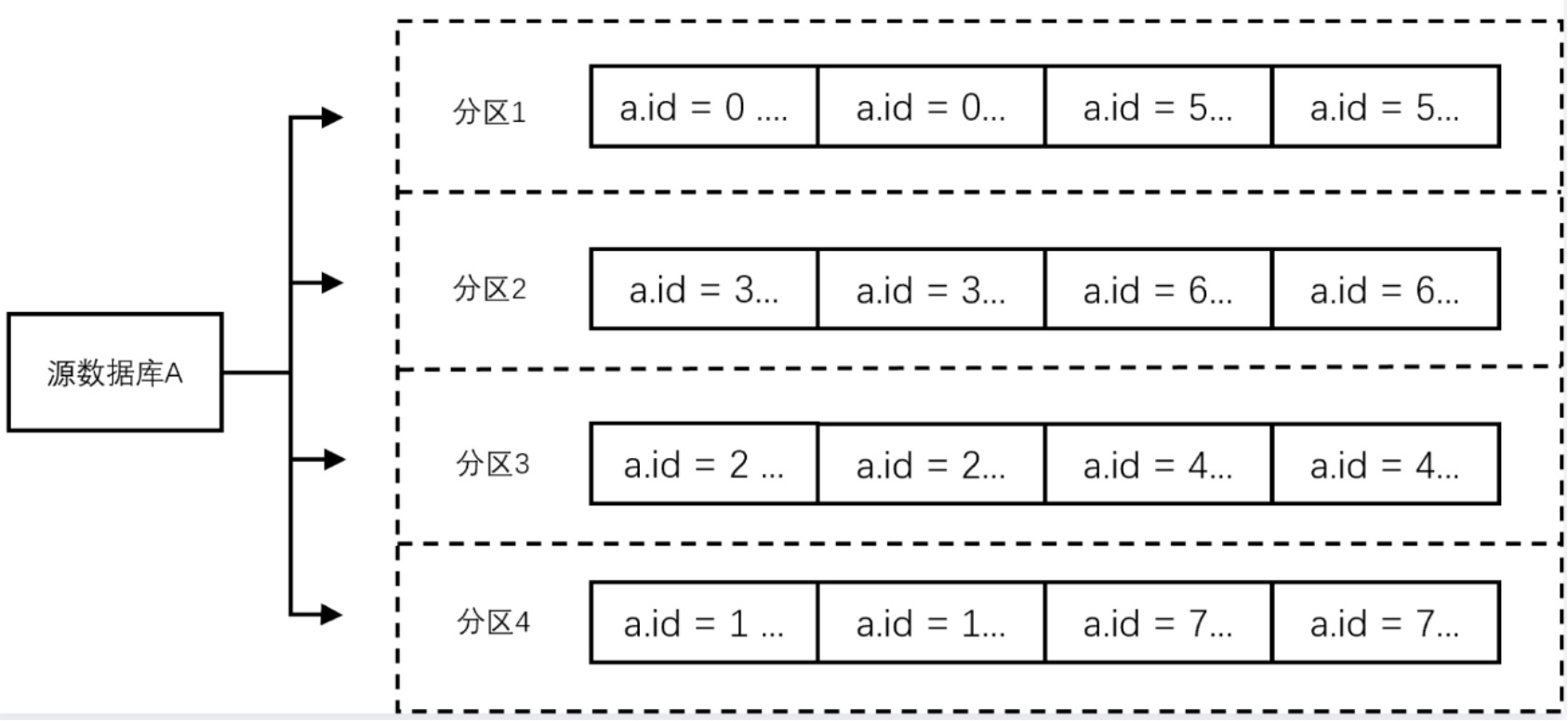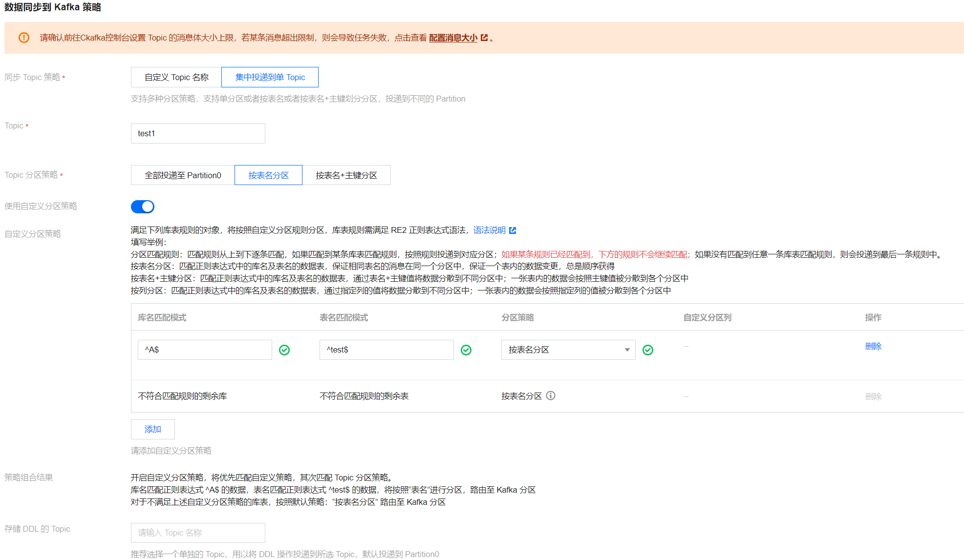 | Topic 分区策略(默认分区策略)+自定义分区策略 | 1. 先将匹配到的库、表数据,按照自定义分区策略(支持按表名分区、按表名+主键分区、按列分区)进行投递。 2. 再将剩余未匹配到的库、表数据,按照 Topic 分区策略(默认分区策略),进行投递。 |