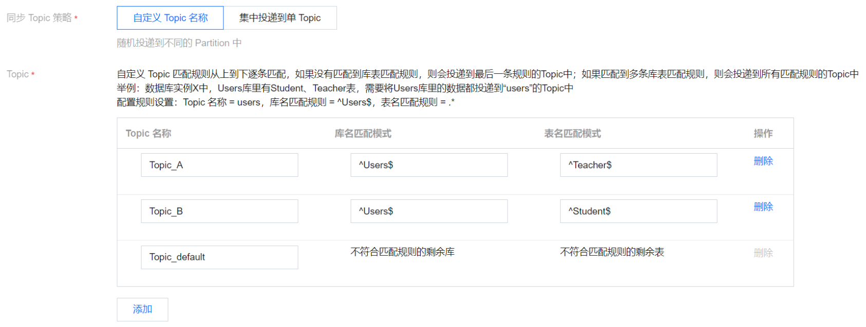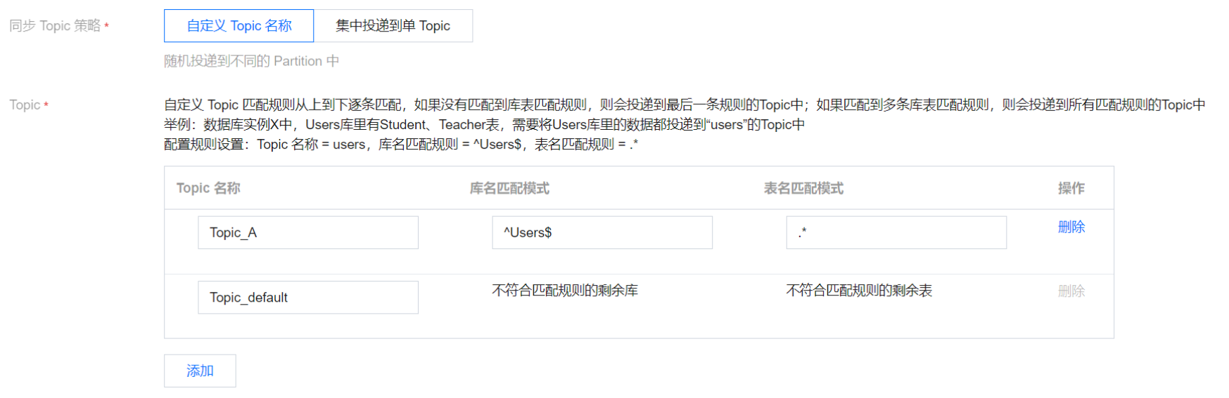 Topic_A | ^Users$ | .* | “^Users$”表示精准匹配Users库,“^”为开始符,“$”为结束符;仅填入“Users”表示匹配所有包含Users的库名,如表X_Users_1会匹配上。 “.*”表示匹配所有的表名。 |