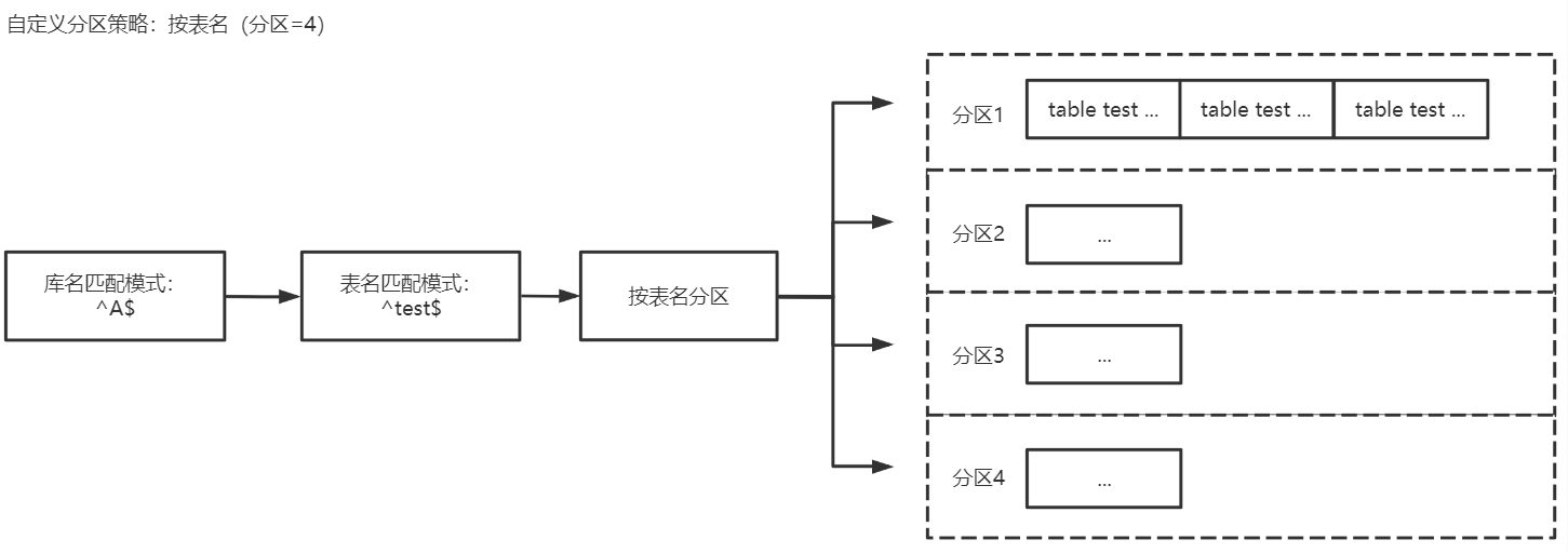 test 表应该为 ^test$。== 来匹配,大小写不敏感。^A$,表名匹配模式填入 ^test$,选择按表名分区后,A 库中 test 的数据会投递到同一个分区中,test 除外其他未匹配到的库表数据会根据 Topic 分区策略(默认分区策略)中设置的策略进行投递。