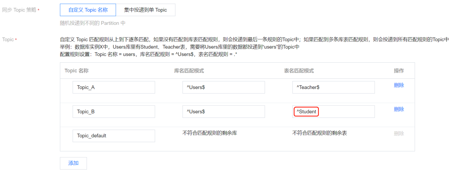 Topic_A | ^Users$ | ^Teacher$ | “^Teacher$”表示精准匹配表名 Teacher,“^”为开始符,“$”为结束符;如果仅填入“Teacher”,则会匹配包含 Teacher 的所有表,如 F_Teacher_1会匹配到。 |