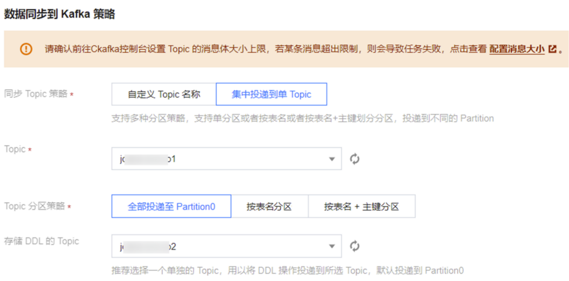 集中投递到单 Topic | Topic 分区策略(默认分区策略) | 全部投递至 Partition0:全部投递到单 Topic 中的第一个分区。 按表名分区:将同一个表的数据投递到同一个分区。 按表名 + 主键分区:将同一个表中相同主键值的数据投递到同一个分区。适用于热点数据,设置后热点数据的表,可以分散投递到不同分区。 |