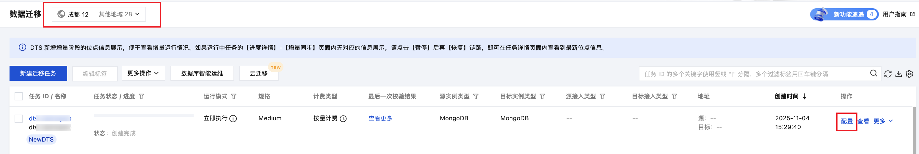 创建模式 | 新建任务:新建一个全新的任务。 创建类似任务:快速创建一个和历史任务相同配置的任务,新的任务中数据库类型、接入方式、计费模式、迁移类型等默认填充的选项都和历史任务保持一致,用户如果需要也可根据情况进行修改。 |