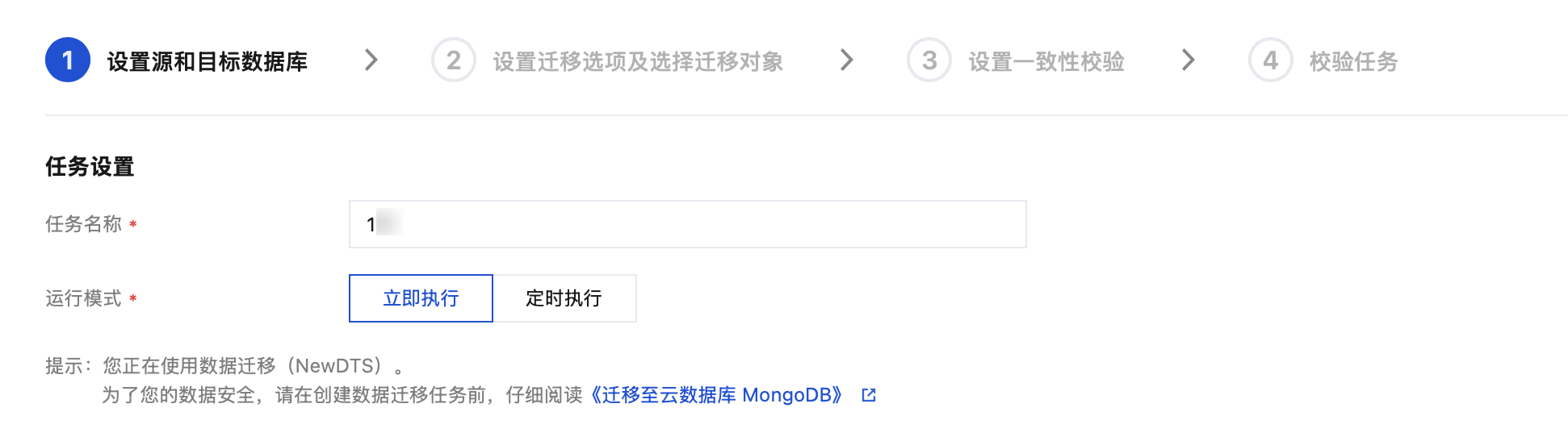 迁移类型 | 请根据您的场景选择。 全量迁移:迁移整个数据库,迁移数据仅针对任务发起时,源数据库已有的内容,不包括任务发起后源库实时新增的数据写入。 全量 + 增量迁移:迁移数据包括任务发起时源库的已有内容,也包括任务发起后源库实时新增的数据写入。如果迁移过程中源库有数据写入,需要不停机平滑迁移,请选择此场景。 |