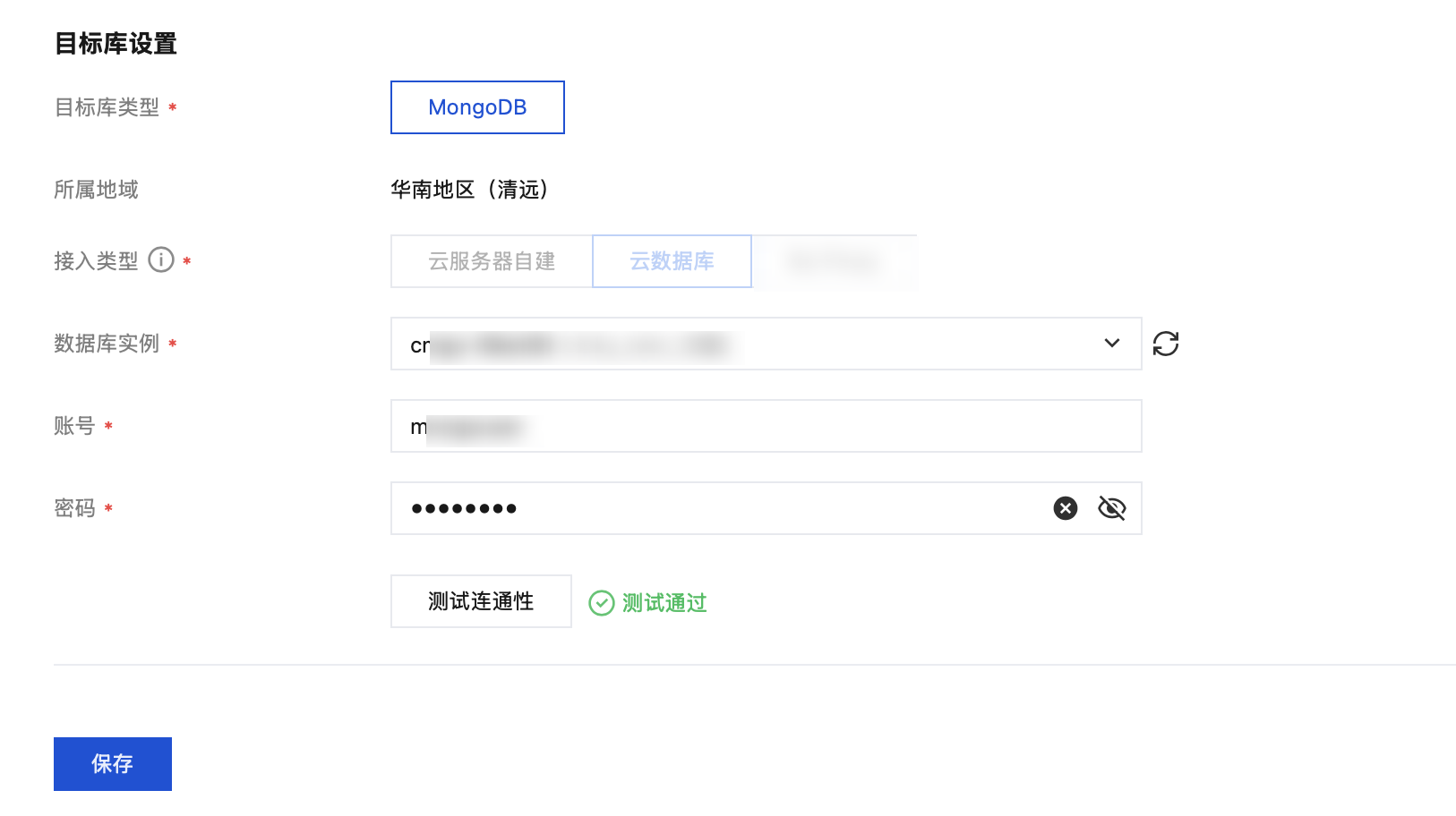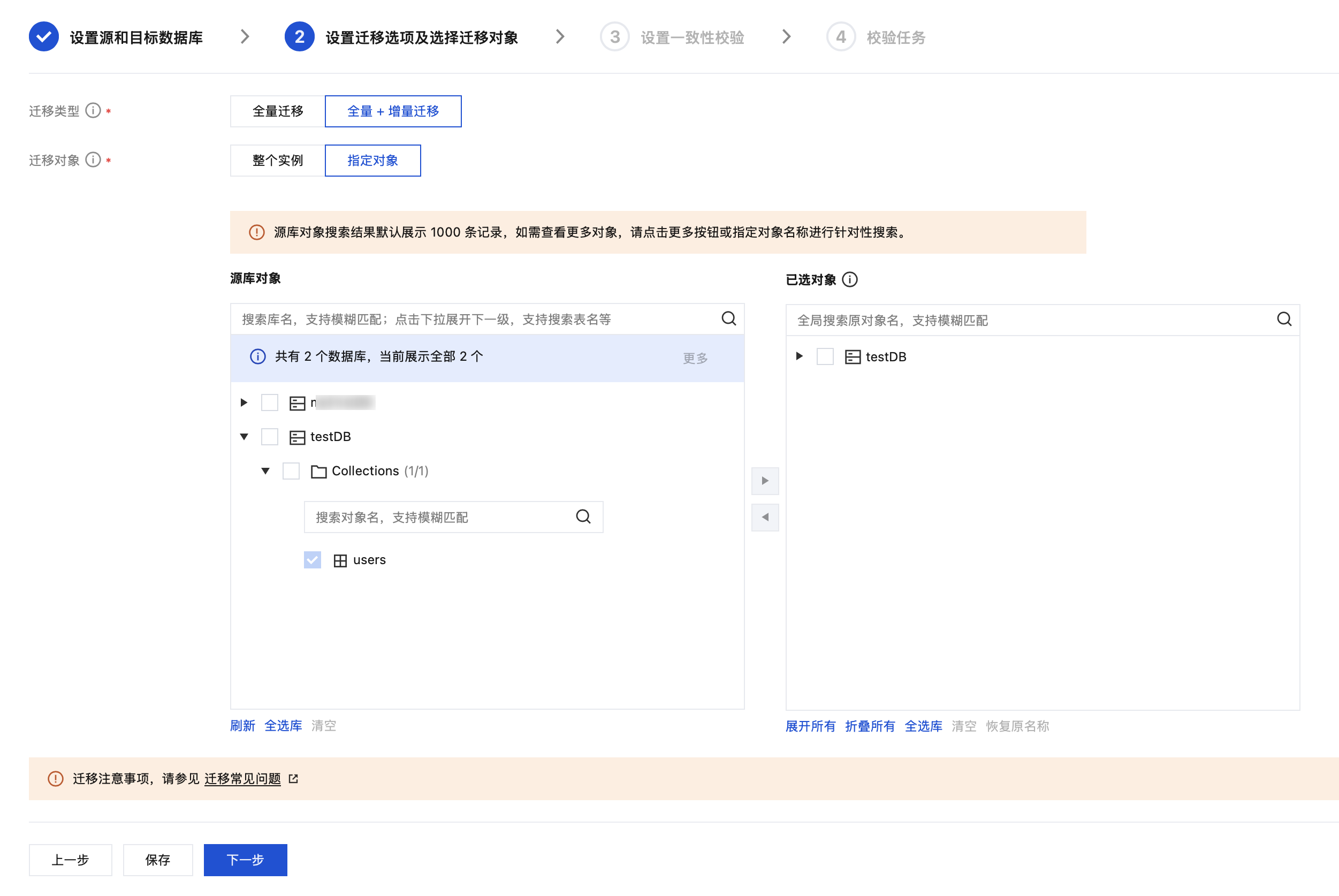 迁移对象 | 整个实例:迁移整个实例,但不包括系统库:admin、local、config。 指定对象:迁移指定对象。 |