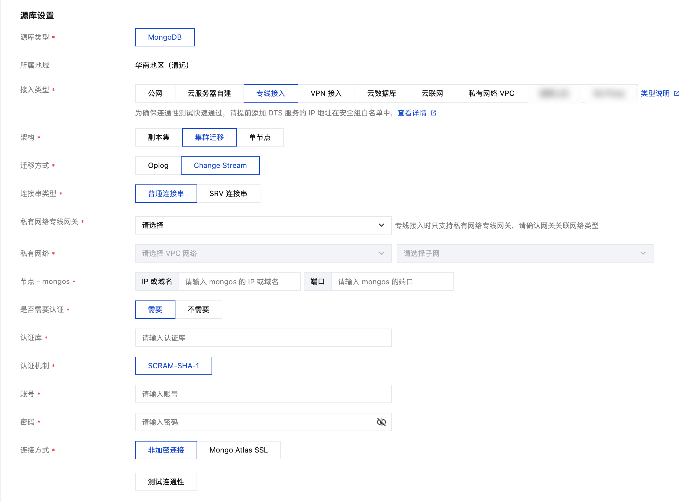 架构 | 接入类型选择“云服务器自建/专线接入/VPN 接入/云联网/私有网络 VPC”时显示该参数。请根据实际情况选择。 副本集:指源库为副本集,每一个副本集由一个 Primary 节点和一个或多个 Secondary 节点组成的架构。 集群迁移:指源库为分片集群,每一个分片集群由 mongos 节点、config server、shard 节点等组件组成的架构。 单节点:指源库集群为单个节点来进行读写操作。 说明: 选择一种架构类型,并且连通性测试通过后,不能再修改为其他架构类型,否则任务会报错。 |