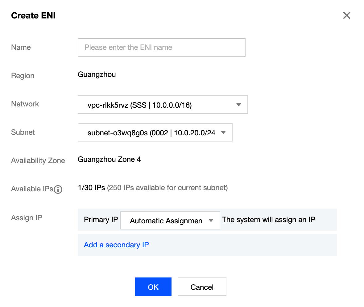在弹窗中,输入名称,选择弹性网卡的所属私有网络、子网后,选择分配的内网 IP (可自动分配也可手动填写),如需添加标签可展开