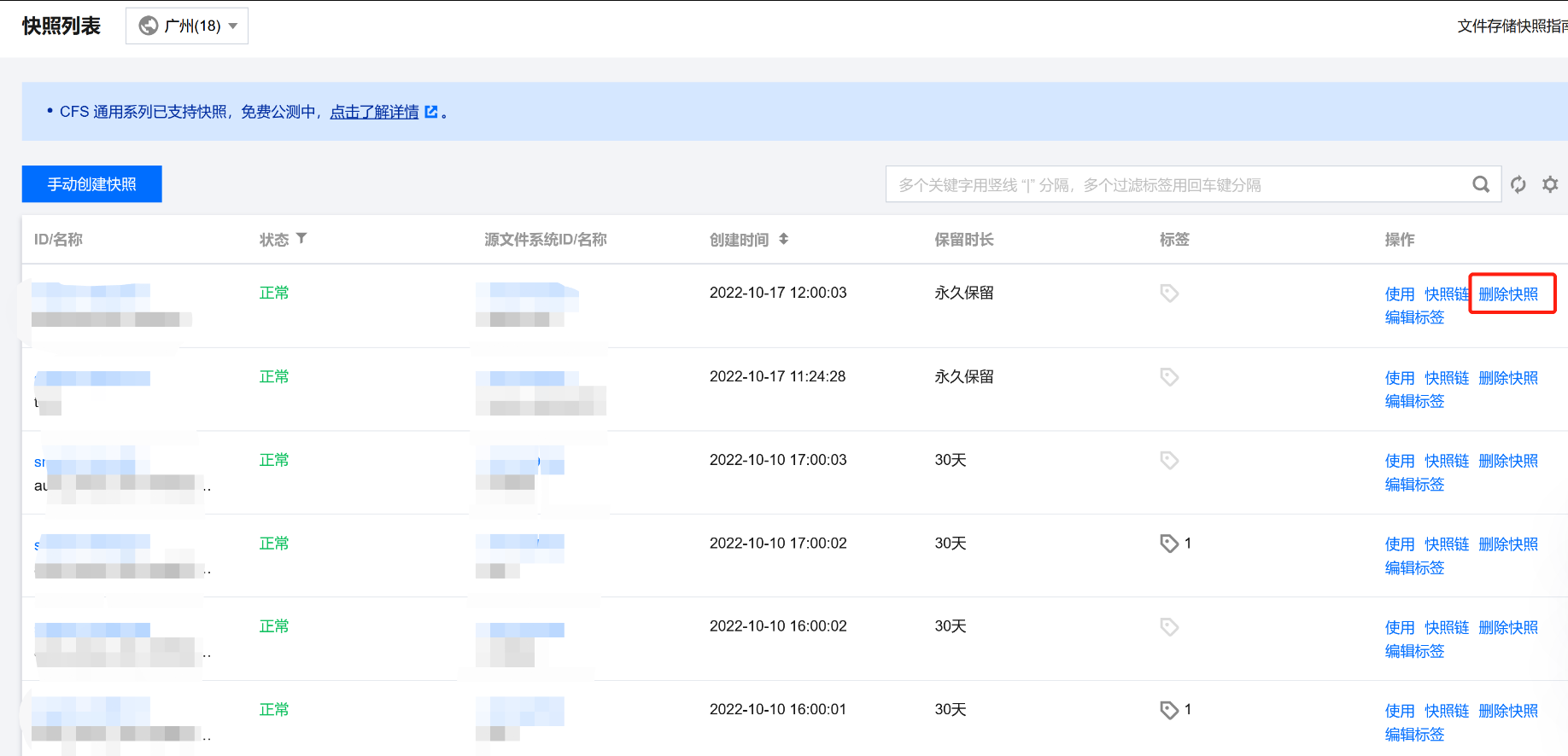 1. 登录文件系统控制台,进入 快照概览 页面,查看快照在各个地域的使用情况。 2. 根据实际需要,进入 快照列表 页面,单击删除快照。 3. 确认待删除的快照信息: