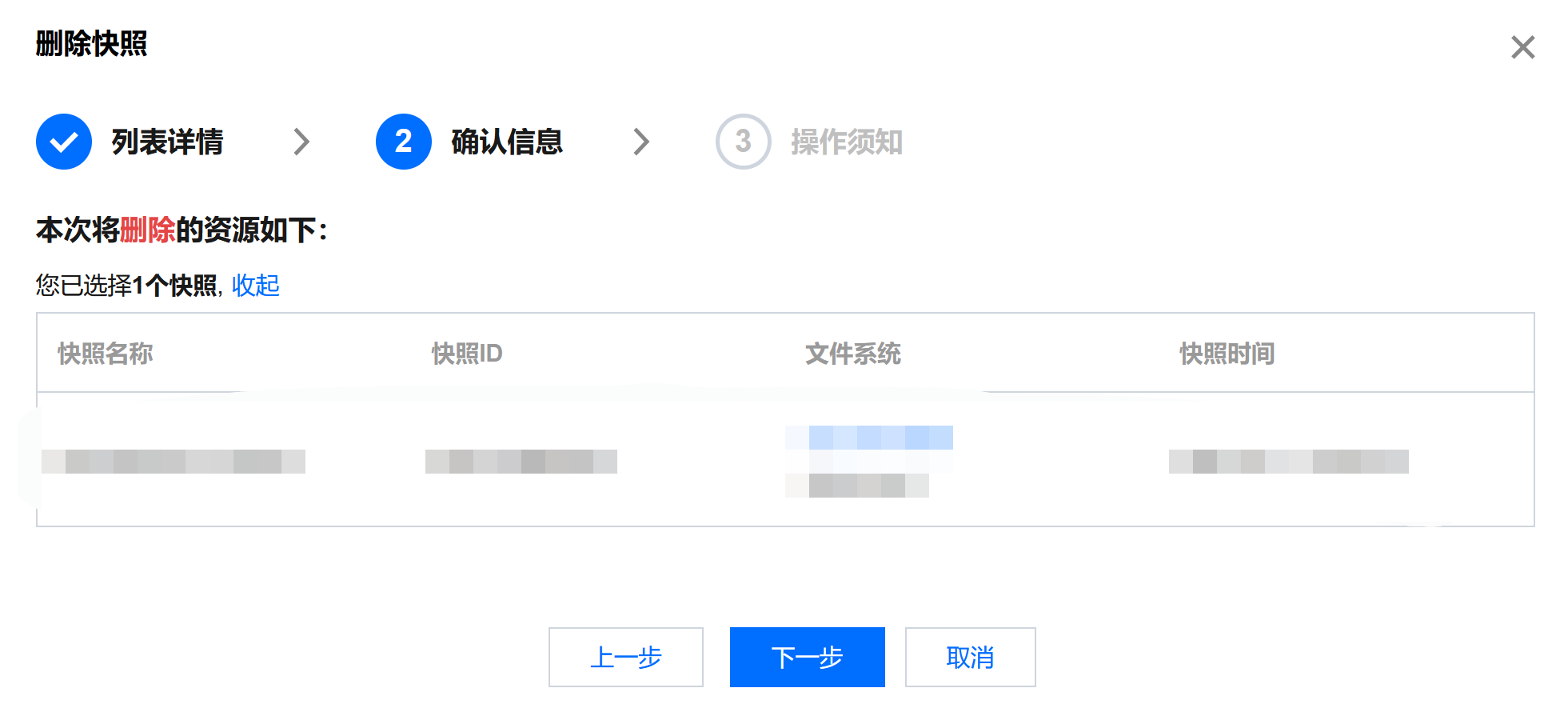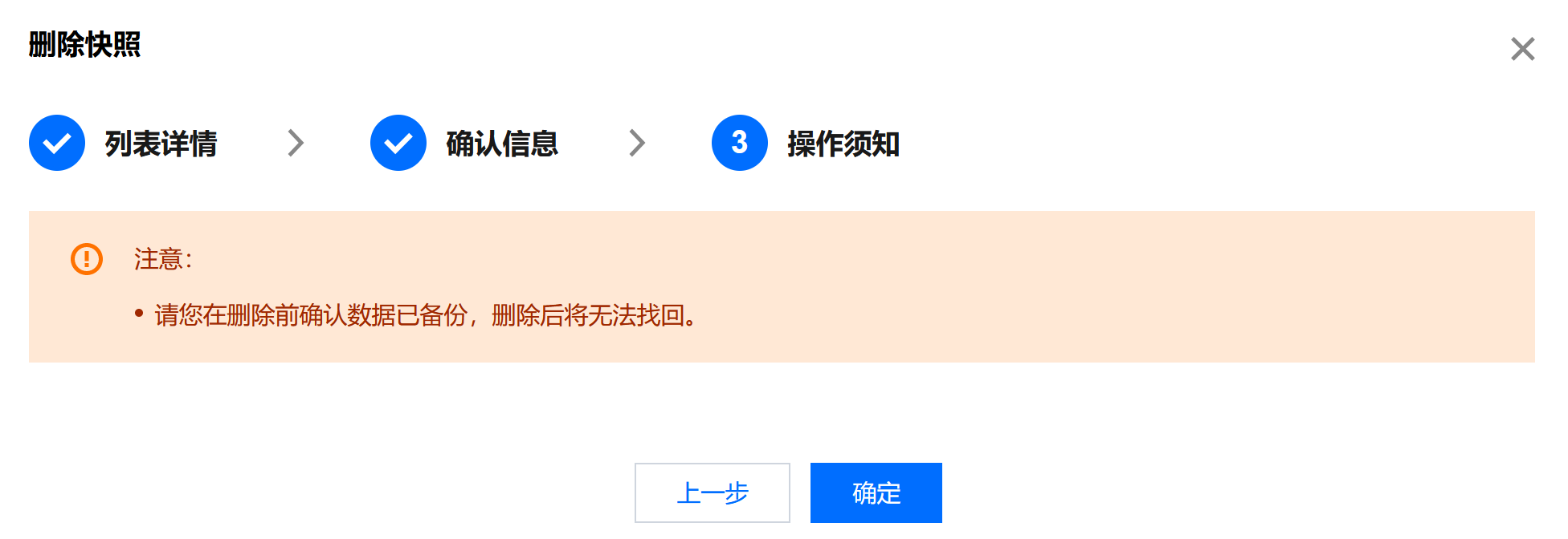 删除快照时,会同时删除快照中所有数据且数据不可找回,已删除的快照不可恢复,请谨慎操作。