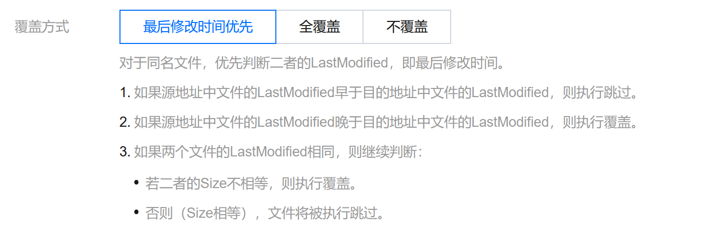 目前支持最后修改时间优先、全覆盖、不覆盖三种方式: 最后修改时间优先:对于同名文件,优先判断二者的 LastModified,即最后修改时间。
