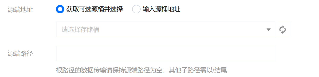 目前支持通过控制台选择存储桶和输入源桶地址(对象存储访问域名)两种模式,可根据实际需要自行选择。根路径的数据传输请保持源端路径为空,其他子路径需以/结尾。