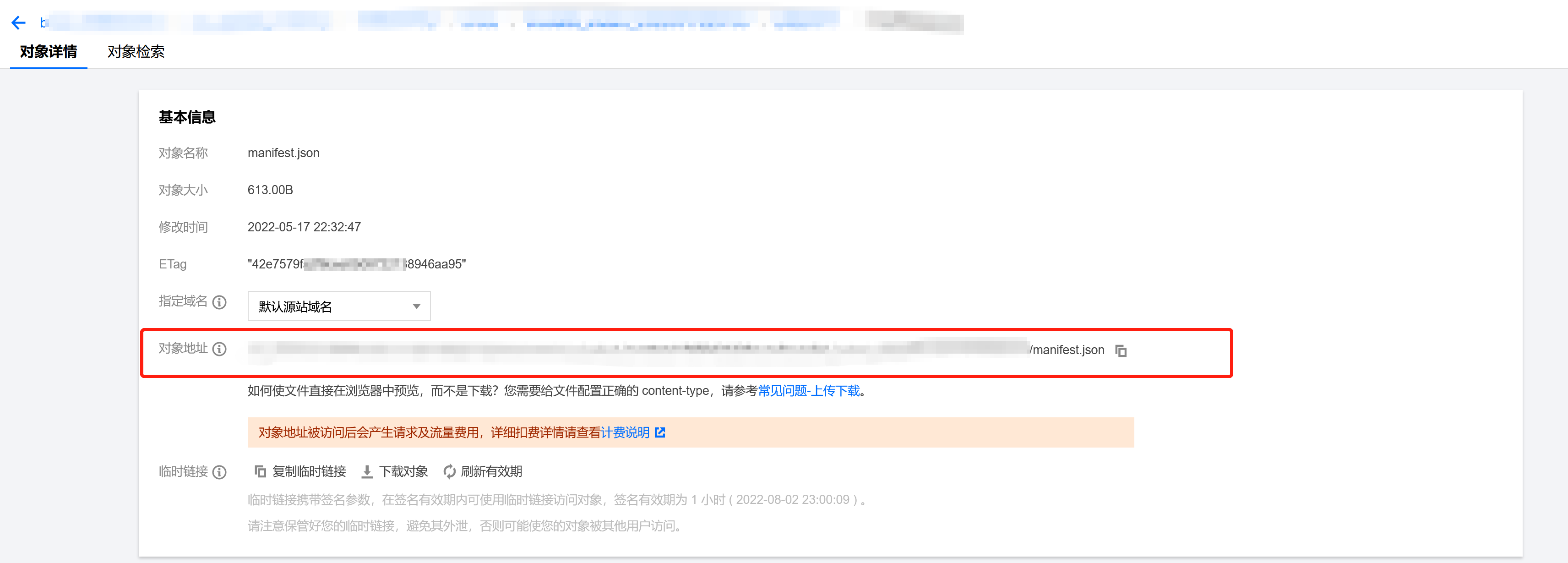 请填写对象存储清单 manifest.json 文件的 URL 地址,生成清单后找到 manifest.json 文件的地址,并填入清单地址。